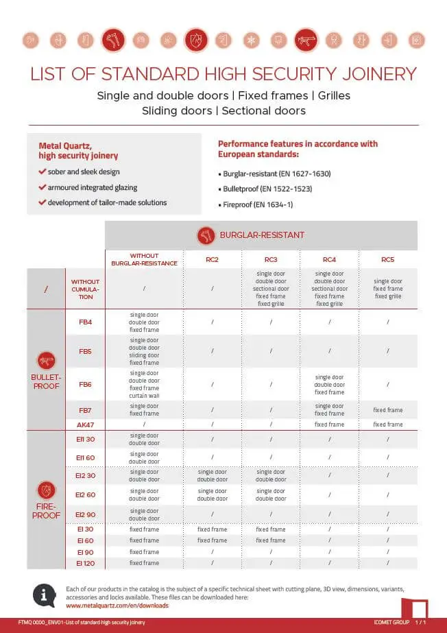 • Performances: P1, Fire resistance, Burglary resistance, EI2-30, RC3, EI2-60, RC4, EI-30, RC5, EI-60, Bullet Proof, EI-90, FB3, EI-120, EI1-30, EI1-60, Prison, AE20, P0, FB4, FB5, FB6, FB7, AK47